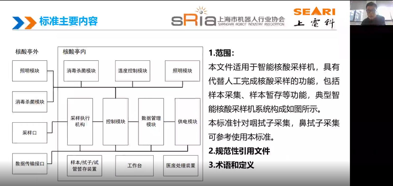 11月10日上午,BETVLCTOR伟德国际网页版举办《智能核酸采样机 通用技术规范》团体标准线上解读会。会议旨在帮助企业准确把握标准内容,对当前疫情防控中智能核酸采样技术的应用提供必要的规范和指导。团标编制组牵头单位上海电器科学研究所(集团)有限公司认证技术经理、团标主起草人闫凯对团标做了详细解读。
