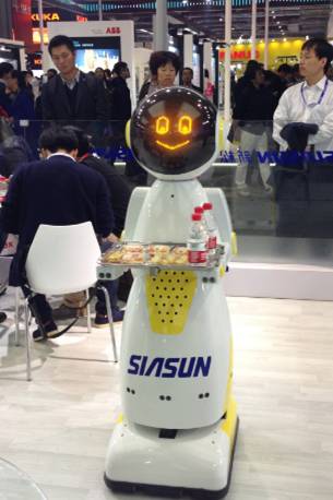 新松:在本届工博会机器人展上,新松展出的机器人主题餐厅很好地体现了机器人在服务型行业的应用。主题餐厅共展示了送餐服务机器人、讲解引领机器人以及迎宾展示机器人,半人高的它们有着圆圆的脑袋,利用轮子自主行走,端着茶水或食品到指定餐桌,还能与人“语音对话”,介绍菜品。这些机器人不仅可用于餐厅,还可通过为其植入不同的知识库,应用于商场、展馆、银行大厅、售楼处、政府办事大厅等场所。