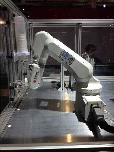 中信重工:这款互联网咖啡机,是一款迎合智能机器人和“互联网+”消费行为的概念型产品。在操作界面上选择完成不同口味的咖啡,系统自动生成二维码,消费者通过任意可登陆微信的移动终端扫描二维码并支付,智能控制系统通过工业以太网将接收到信息传输给工业机器人,并控制机器人在一分钟内将口味纯正的咖啡呈现到消费者面前。通过智能控制系统将工业机器人和移动互联网技术融合于一体,这种概念可以广泛应用于工业自动化领域的远程通讯和监控。
