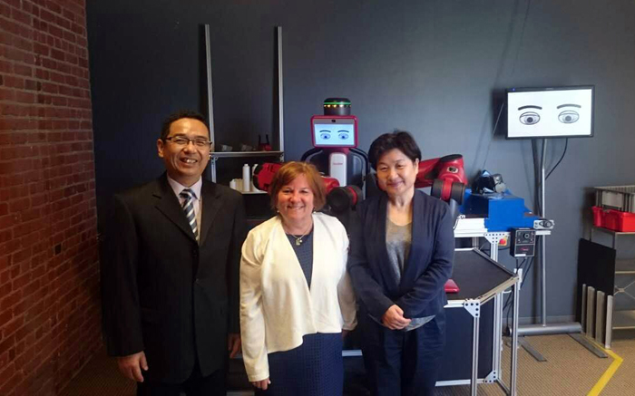 次日上午,唐贵发一行访问位于波士顿的Rethink机器人企业总部,公司市场高级总监Sue Sokoloski女士对中国工博会机器人展的介绍表示了浓厚的兴趣,对东浩兰生和协会的参展邀请,欣然应允考虑。Sue也向协会一行介绍了该公司的产品及发展历史,随后,陪同参观了公司,并展示了Baxter机器人,现场体验Baxter机器人的操作及应用。