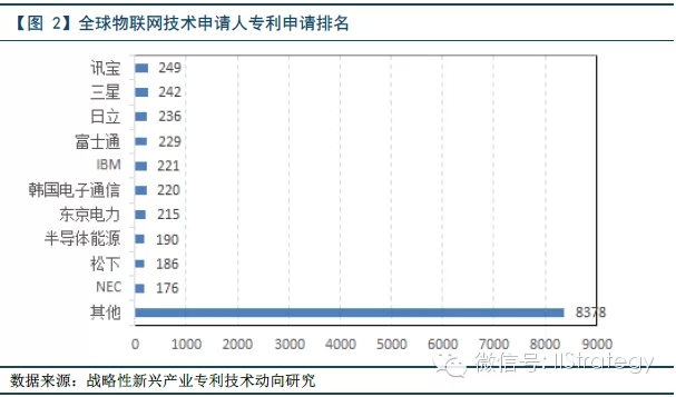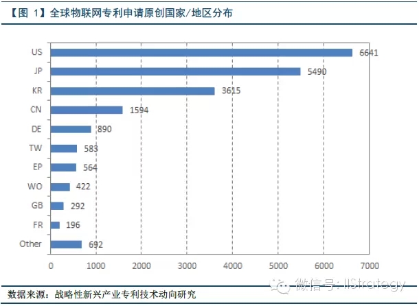 首先,从物联网世界范围专利优先权国家分布情况来看,其中,美国专利优先权的申请数量为6641件,其比重达到34%,排名居世界第一。而中国专利申请量为1594件,仅为美国1/4。此外,在物联网核心关键技术方面,如RFID标签、非接触式智能卡、应答装置、发射接收器等,美日韩都排名前三位,核心优势明显。而中国对物联网的研发主要集中在拓展物联网的实际应用层面,对核心关键技术的积累与国外巨头存在十来年的差距。