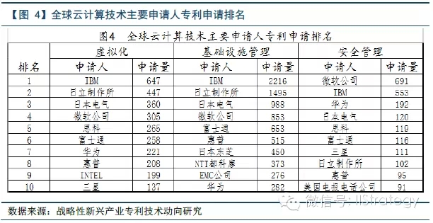 另一方面,对各技术主题全球主要申请人的排名和对应申请量分析可知,在云计算领域内,各技术主题的主要申请人重复出现多次,如IBM、微软、株式会社日立制作所、惠普等,说明这些公司在云计算领域占据领先的竞争优势。从主要申请人的国别来看,美国的公司占据了大部分的排名,优势依然遥遥领先。值得一提的是,中国的华为技术有限公司也在多个技术主题上名列全球主要申请人的前十名,华为近些年在云计算上发展迅速,在全球范围内还是具有一定的竞争优势。