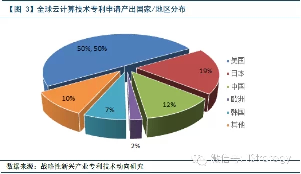 从云计算技术产出国家/地区构成比例来看,美国、日本、中国、韩国和欧洲的专利申请占到云计算技术申请总数的90%,说明这五个国家和地区是云计算领域的主要技术力量。特别是美国,其一国的专利申请量竟占到总量的50%,是名符其实的云计算技术强国。相比之下,中国虽在申请量上占有一定的优势,但质量上参差不齐。