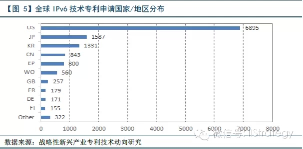 在全球范围内,美国、日本、韩国和欧洲是云计算领域的主要专利申请产出地区,尤其是美、日比较突出。首先,从IPv6技术的全球专利申请的国家区域分布来看,美国的专利申请量竟高达6895件,占专利申请总量的53%,位居世界第一,是第二名日本的四倍。这也体现了美国在IPv6技术领域具有绝对的技术优势。而中国在该领域的专利申请量仅为843件,约为美国的1/7,日本的1/2,与美、日差距明显。
