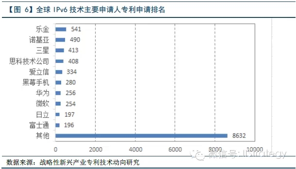 其次,从IPv6技术领域的主要申请人的申请情况来看,该领域全球排名前十的申请者主要集中在美、日、欧、韩,中国只有华为进入了全球前十的行列。进一步分析发现,排名前十的专利申请总量为3369件,仅占全球专利申请总量的28%。这说明,从公司层面看,IPv6技术分布还比较松散。