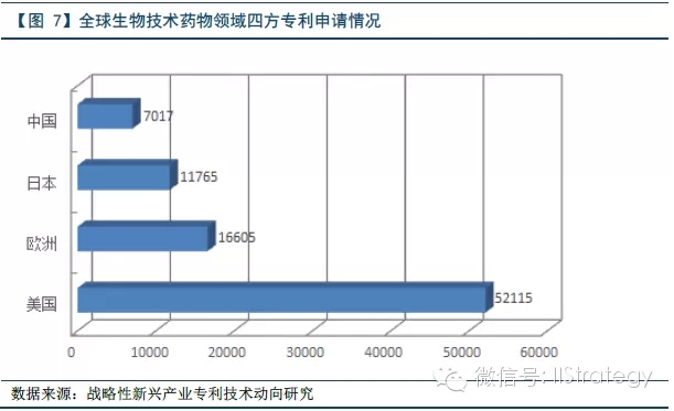 在生物技术药物领域,美国、欧洲、日本技术竞争力最强。首先,从生物技术药物国家/地区专利申请分布来看,美国、日本、欧洲、中国四方中,美国申请量最大,占到了全球专利申请总量的一半以上(包括美国申请人参与的合作申请);而中国申请人申请量最小,仅占全球专利申请总量的10%。并且,美国申请人在该年全球专利申请总量中所占的比重均超过一半,创新、研发绝对优势显著。