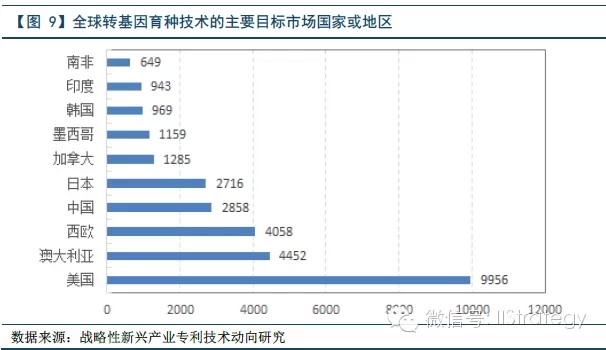 全球范围内,美国、澳大利亚、西欧、中国、日本式转基因技术投放的主要目的地国家和地区。其中,美国的孟山都、杜邦-先锋,以及欧洲的巴斯夫和先正达在转基因育种方面的研究几乎涉及转基因育种操作的整个流程,技术优势十分明显。整体而言,中国与美国、欧洲有较大的差距,但在杂交技术、组织培养等方面具备一定的优势。