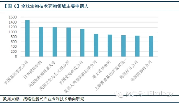 其次,从生物技术药物领域主要申请人分布看,在全球申请量排名前十的申请人中,美国基因泰克公司专利申请量排名第一,共有六位申请人位居前十,而中国只有上海博德基因开发有限公司一家入围前十。