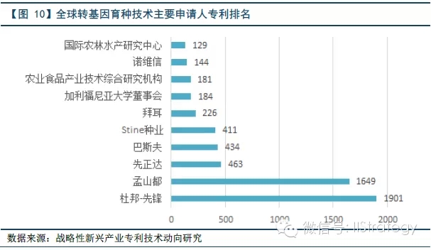 另一方面,在全球排名前十的申请人中,美国企业共占据了四席,位居第一。并且,杜邦-先锋和孟山都两者专利申请量占了全球申请总量的24%,反映出美国在转基因育种领域的领导地位。不仅如此,这些大型育种公司推动技术产业化的能力也处于世界领先水平。相比之下,中国排名第一的中国科学院及其下属研究所的专利申请量仅位居全球第16位,与美国大型育种公司差距明显。
