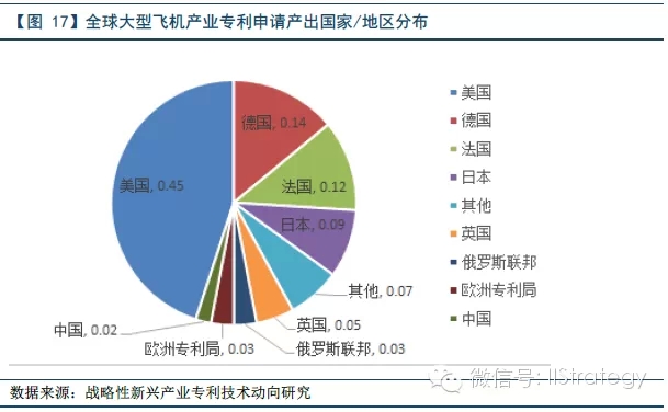 首先,从全球大型飞机产业专利申请分布情况来看,美国专利申请量最多,并且美、德、法三国的专利申请总量就占了全球申请总量的71%,三国在大型飞机领域处于绝对主导地位。反观我国在大型飞机产业中处于刚刚起步阶段,技术上还比较落后,在知识产权方面所取得的成果还比较少。