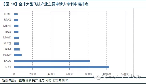 其次,进一步分析全球大型飞机产业主要申请人,可以发现,美国的波音公司和欧洲空中客车公司的专利申请量遥遥领先其他申请人,两者的专利申请量就占据全球的60%左右,集团垄断优势十分显著。这种垄断格局还将会持续较长时间,中国目前正处于起步发展阶段,与上述两个国家或地区还有较大的差距。