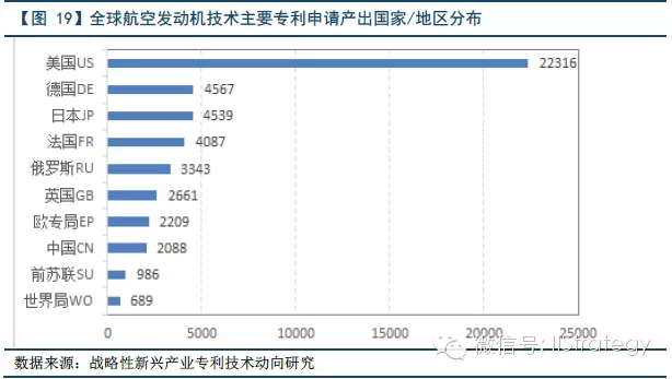 目前,航空发动机制造业呈现出高度垄断的格局,美国、德国和日本的公司掌握了主要的研发和应用技术。其中,美国以22316件专利申请量位居第一,申请量遥遥领先其他国家和地区。德国、日本分别排名第二、第三,而中国虽然起步较晚,航空发动机的专利申请量仅为美国的1/10,德国的1/2。无论从专利数量还是质量来看,都美、德、日存在很大的差距。