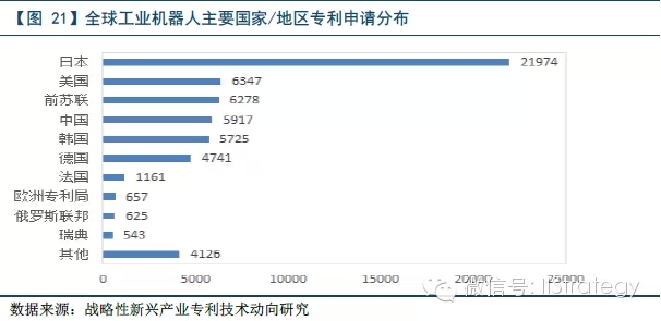 在工业机器人技术领域,日本专利申请量遥遥领先,在该领域占有非常领先的技术优势。具体来看,首先,从全球工业机器人技术领域专利申请情况来看,日本以21974件专利申请量遥遥领先其他国家和地区。美国的专利申请量为6347件,居于日本之后,位列第二,但其数量仅为日本的1/3。此外,中国专利申请量为5917件,名列第四。虽然中国近些年专利申请量大幅提升,并且形成了一定数量的专利保护,但技术门槛相对较低,与日本、美国等发达国家还存在很大的技术差距。