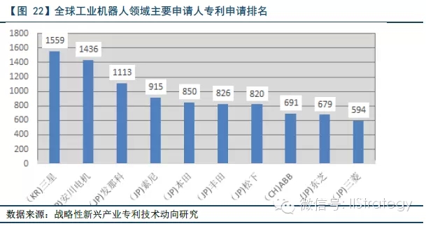 其次,从专利申请排名前十位的申请人来看,排第一位的是韩国三星,排第八位的是瑞典ABB,其余均为日本企业,可见日本在工业机器人领域占据着领导地位。美国、中国在此方面和日本相比都存在着不小的差距。