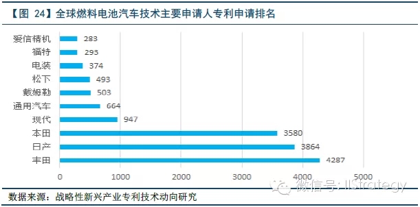 从全球燃料电池汽车领域主要申请人分布来看,排名前十的申请人主要集中在日、美、欧、韩四方,其中,日本共有五家公司入围前十,集团优势十分显著。反观中国则没有一家本土企业的专利申请量进入前十,说明中国在燃料电池技术本身与发达国家存在很大差距。