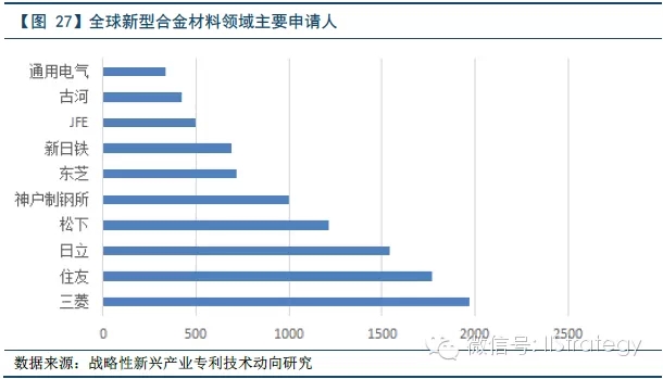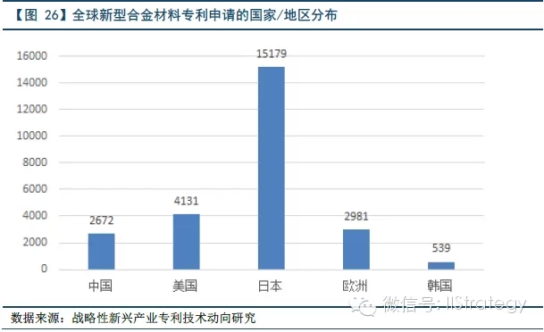 日本是整个新型合金材料产业处于用于较大优势。首先,从全球新型合金材料领域专利申请的国家来看,日本原创申请量最大,占五个国家原创总量的1/2。美国、中国分别位居第二、第三,但都与日本的差距巨大,分别仅为日本的17%、27%。其中,美国的专利主要集中在生物医用、电子信息、新能源、航空航天、资源环境等;而中国主要侧重于新能源、生物医用、电子信息,与美国的交叉性强。