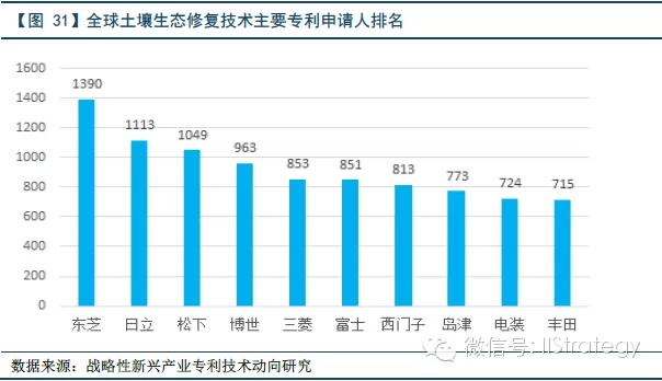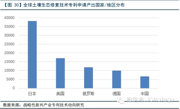 在土壤生态修复技术领域,日本申请人专利申请总量远高于其他国家和地区,美国、欧洲近些年申请量有所降低地,而中国增速迅猛,但缺乏具备全球竞争力的跨国公司。