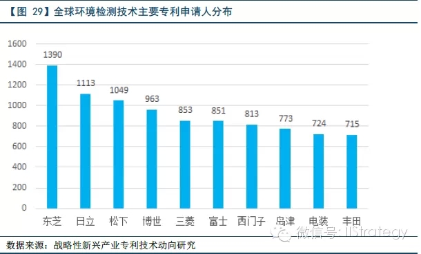 而从全球环境监测技术领域主要申请人情况来看,在全球排名前十的申请人中,日本申请人占据了六席,进一步证明日本在该领域已取得竞争优势;欧洲占据三席,美国通用电气占据一席。尽管美国申请人的申请优势并不明显,但美国的研发团队类型多样,包括电子产品企业、汽车生产企业、高校以及政府部门。中国由于环境污染问题严重,近年来对环境检测技术的研发投入加大,未来会保持快速增长势头。