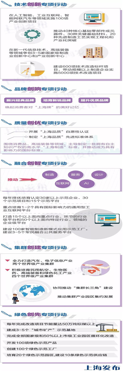一是放大品牌效应,让上海制造在国内外叫得响。具体分为经典品牌、新锐品牌和优质品牌三个层次,以新技术、新模式和新机制,赋予老凤祥、三枪等经典品牌新的气质,加快培育联影、蔚来等一批新锐品牌。