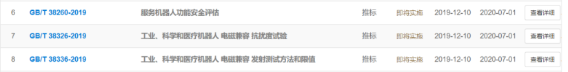 国家标准化管理委员会发布的3项有关机器人技术的国家推荐标准于7月1日正式实施。其中包括《GB/T 38260-2019服务机器人功能安全评估》、《GB/T 38326-2019工业、科学和医疗机器人 电磁兼容 抗扰度试验》、《GB/T 38336-2019工业、科学和医疗机器人 电磁兼容 发射测试方法和限值》。