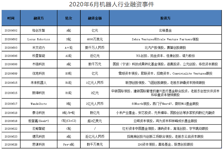 据公开数据显示,6月机器人行业融资事件有十余起,融资额达上亿元,大部分集中在B轮及B轮以后,主要分布在工业互联网平台、智能仓储、移动机器人、半导体制造业等领域。其中泰治科技完成了数亿元的B轮/B+轮融资;德国Wandelbots机器人公司获得2亿元人民币(3千万美元)B轮融资;优地科技完成亿元B3轮融资;极智嘉(Geek+)完成C2轮融资;德风科技获得近亿元人民币A轮融资;格创东智完成人民币亿元级A轮融资等。