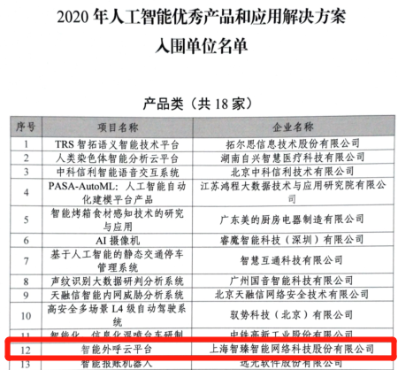 2月8日,小i机器人自主研发的“智能外呼云平台”入选国家工业信息安全发展研究中心“2020年人工智能优秀产品和应用解决方案”名单。